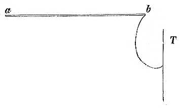 PREYER ezeket a kis írómozgásokat szellemes modon jegyezte fel egy kis táblára. E czélra az itt ábrázolt egyszerű készüléket használta. Ez hosszú, könnyű és vékony rudacska (a b), melyen b-nél meghajlított aczéltű van s a mely lehető legcsekélyebb ellentállással egy sarnír [csuklópánt] körül forog. Az aczéltű hegye a T-tábla kormozott lapját épen érinti. Ha már most a rudat a-nál erősen rákötjük a kezünk hátára, vagy írótoll módjára kezünkben tartjuk és ha ilyenkor ka-