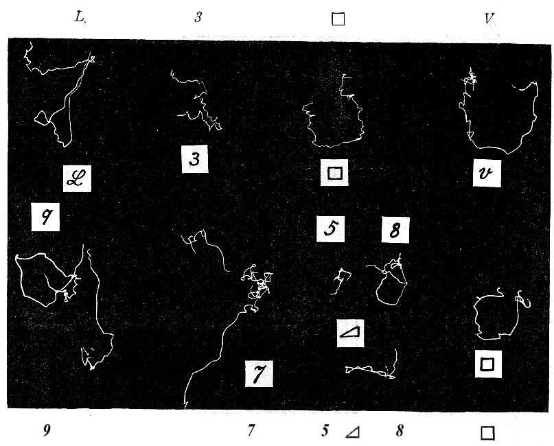 mészetszerűleg nem tünik el, ha az ember valamely meghatározott tárgyra gondol, a keletkezett rajzok (melyeket oldalról kell nézni (*)) többnyire sokszorosan kanyarodó vonalak, melyekből gyakran alig lehet kiolvasni, hogy mire gondolt az illető. Ezért ez magyarázatként jár az ábrával. A gondolt alakot a rajz mégis mindenütt annyira megközelíti, hogy világosan látható, hogy a képzelet a mozgás irányának megszabásában itt is mennyire közreműködött.