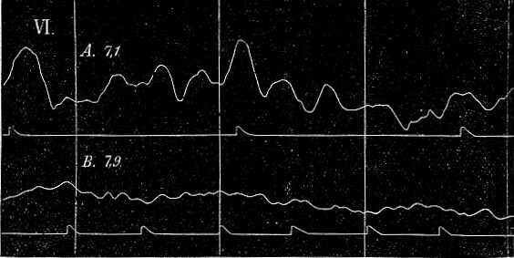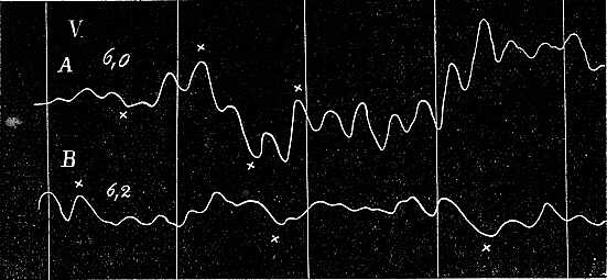 a hogy a taktus ily görbékben nyilvánul, egyénileg különböző és a véralkotástól függ. Ez látszik az 52. és 53. ábrából. Az 52. ábrán az A görbe úgy keletkezett, hogy egy metronom, melynek ütéseit a vizsgált egyén hallgatta, átlag 120 ütést hallatott perczenkint, a B görbe pedig úgy, hogy a metronom perczenkint 40-et ütött. Egészen érdekes dolog megfigyelni, hogyan jut kifejezésre a lassú, csaknem álmos taktus a B görbe egyenletes, nyugodt lefolyásában, míg a háromszorta gyorsabb taktus az A görbét élénk, ideges jellegűvé teszi. Az 53. ábra hasonló változásokat tüntet fel, csakhogy más módon. Mindkét görbe alatt a metronom maga rajzolta fel a taktust, mégpedig úgy, hogy az egyenes vonalon látható kis emelkedések a pillanatot jelzik, melyben az ütés elhangzott. Ebből látható, hogy A-ban (perczenkint 36 ütés) a metronom minden ütése az álmos taktus mellett a görbe egy-egy kiemelkedését hogyan idézi elő, midőn a kisérleti egyént mindannyiszor valósággal megijeszti. Ellenben a B görbe élénk taktusa (117 ütés perczenkint) igen nagyszámú kis rezgést idéz elő.