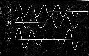 Ha ellenben a résztvevők két csoportba oszolnak, melyek mindegyikének megvan a maga rezgési száma: a dolog egészen másképen fog állani. Egy tekintet az 56-ik ábrára azonnal tisztázni fogja a kérdést. A görbe öt, B görbe négy lengést mutat másodperczenkint; a szemlélhetőség végett a rezgéseket egyenlőknek tekintjük. Ha tehát mindkét mozgás egyidejű lökések útján hat valamely tárgyra, pl. asztalra, akkor ez a valóságban úgy fog befolyásoltatni, a mint a C görbe mutatja. A lökések csak két ízben következnek be pontosan ugyanabban az irányban és kölcsönösen erősbítik egymást; egyéb pontokon ellenben egymás hatását többé-kevésbbé ellensúlyozzák és ez a kölcsönös kiegyenlítés, miként az ábra mutatja, a másodpercznek elég jelentékeny részére fog kiterjedni. Rögtön azután ismét erőteljes lökés következik. Ez utóbbinál azután a résztvevőkben egy bizonyos irány gondolata támad,