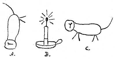 és átnyujtottam H. úrnak. Ő saját rajzához (57. á., B) határozottan hasonlónak találta. Ha az ember akarja, valami távoli hasonlatosságot találhat, csakhogy sajnálatomra én nem is gyertyára, hanem macskára gondoltam volt. Hogy miért nem fejeztem be a rajzot, arra már nem emlékezem; de ha jobbfelől alul még néhány vonást hozzárajzolunk és a rajzot megfordítjuk, megkapjuk gyermeteg rajzát a macskának, melyre gondoltam.