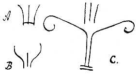 A gyertyához való hasonlóság tehát teljességgel képzeleti értékű, csak az észlelő képzeletében él és semmiképen sem származik gondolatátvitelből. Nem nagyobb a hasonlatosság a RICHET-féle és legtöbb egyéb kísérletben sem. Elég erre egy példa. RICHET egyik kísérletében a szomnambul a mellékelt A), B), C) alakokat (58. ábra) rajzolta egymás mögé és "tál szökőkúttal, középen valami, a hova virágot lehet tenni" gyanánt jelölte meg. Az eredeti rajz rákot ábrázolt. Nos hát, ez alakok látására bizonnyal senki sem gondol rákra; csak akkor talál valami hasonlatosságot, ha tudja, hogy mit ábrázol az eredeti rajz. De ha az eredeti asztal lett volna virágokkal, vagy valamely vízsugarakat lövelő czethal, akkor is találtunk volna hasonlatosságot. Tényleg RICHET az ilyen rajzokban a gondolatátvitelnek határozott bizonyítékát látja. Valósággal ezek a rajzok nem egyebek, mint bizonyítékai az ismert illuziós törvénynek: Valamely ismeretlen dolognak valami ismerthez való hasonlóságát mindig túlbecsüljük.