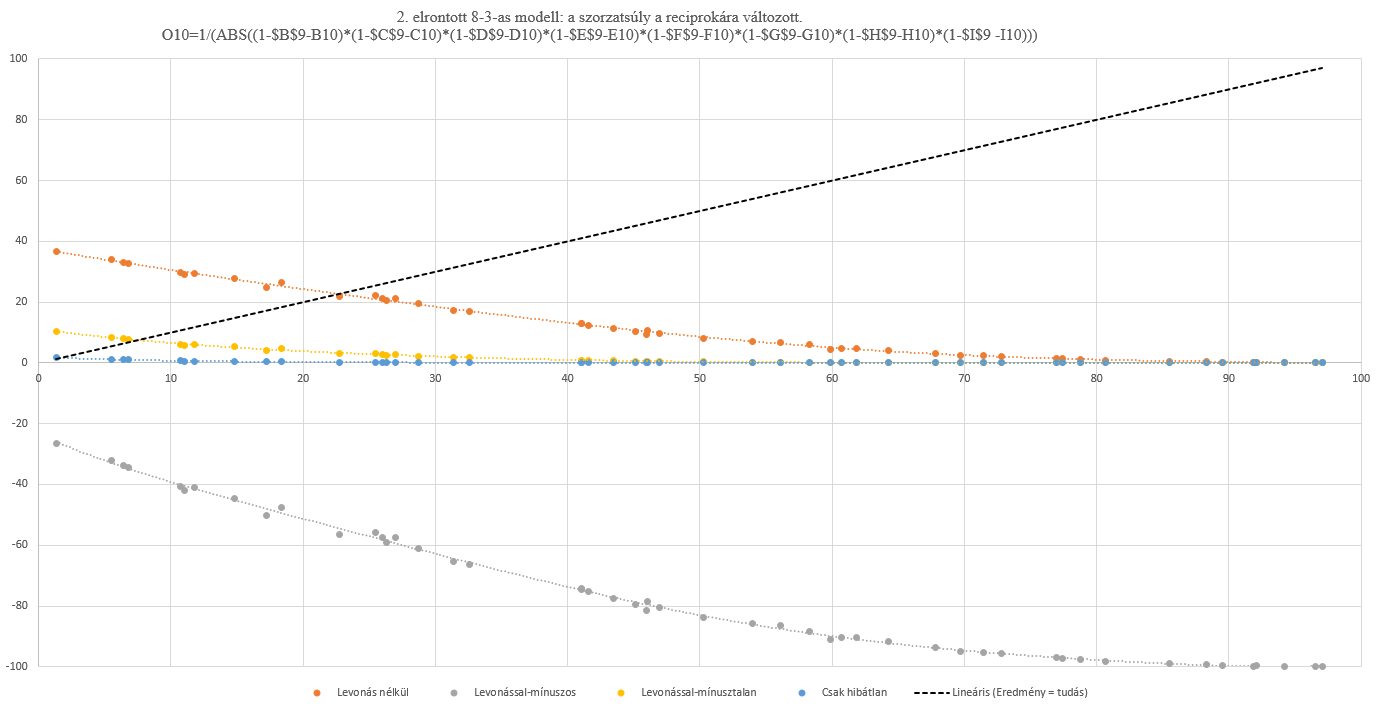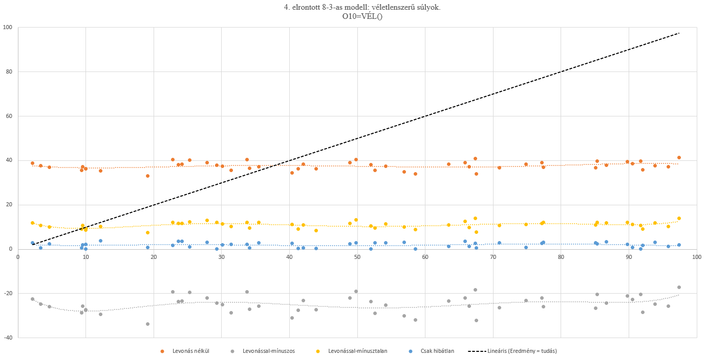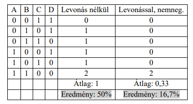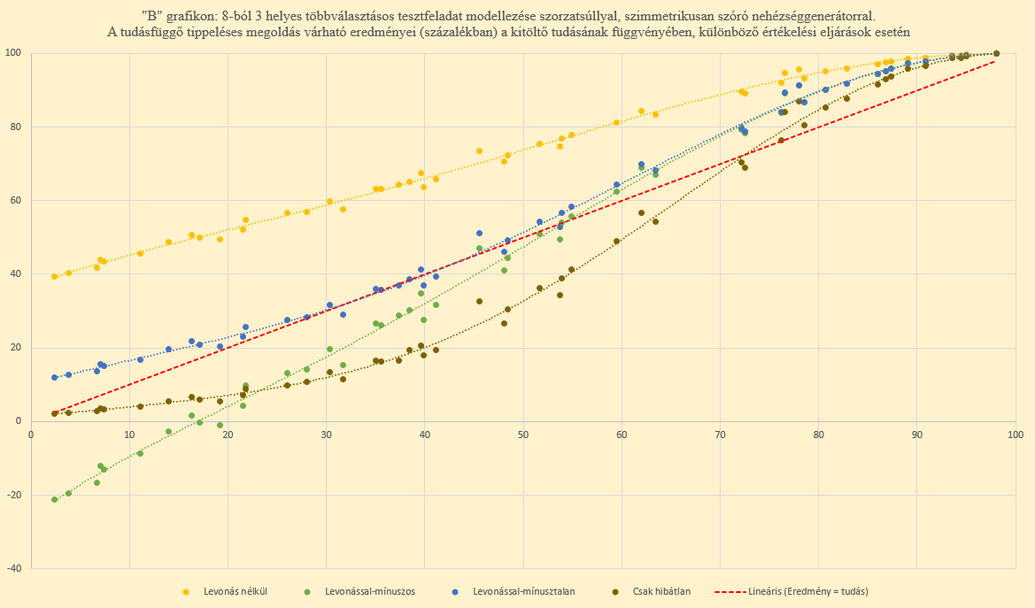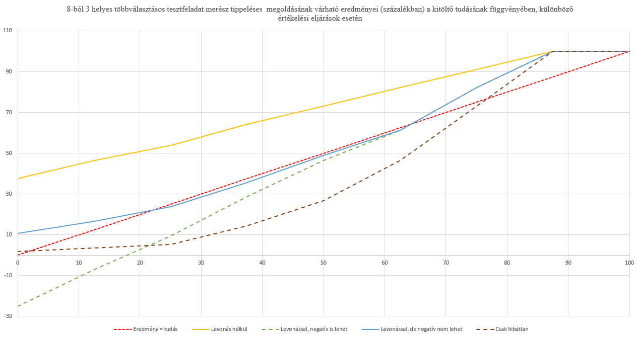 A következtetés annyira lehengerlő, hogy annak láttán a tanulók rögtön elálltak a meggyőzésemtől. És valóban: hogy is lehetne igazságos az a pontozási rendszer, amely egy csupa 4-2-es tesztkérdésből álló redmentás dolgozatnál a semmit nem tudó, vaktában tippelgető tanulóknak statisztikailag 50%-os eredményt valószínűsít? És hogyan lehetne ez "az egyetlen korrekt pontozás?" A választ rábízom az értő olvasóra...