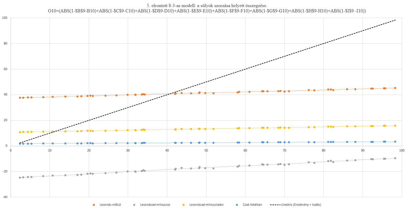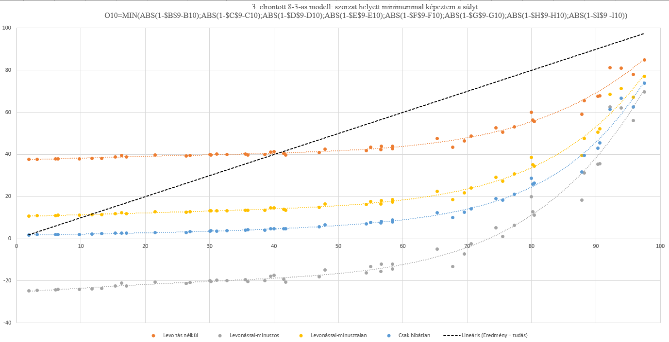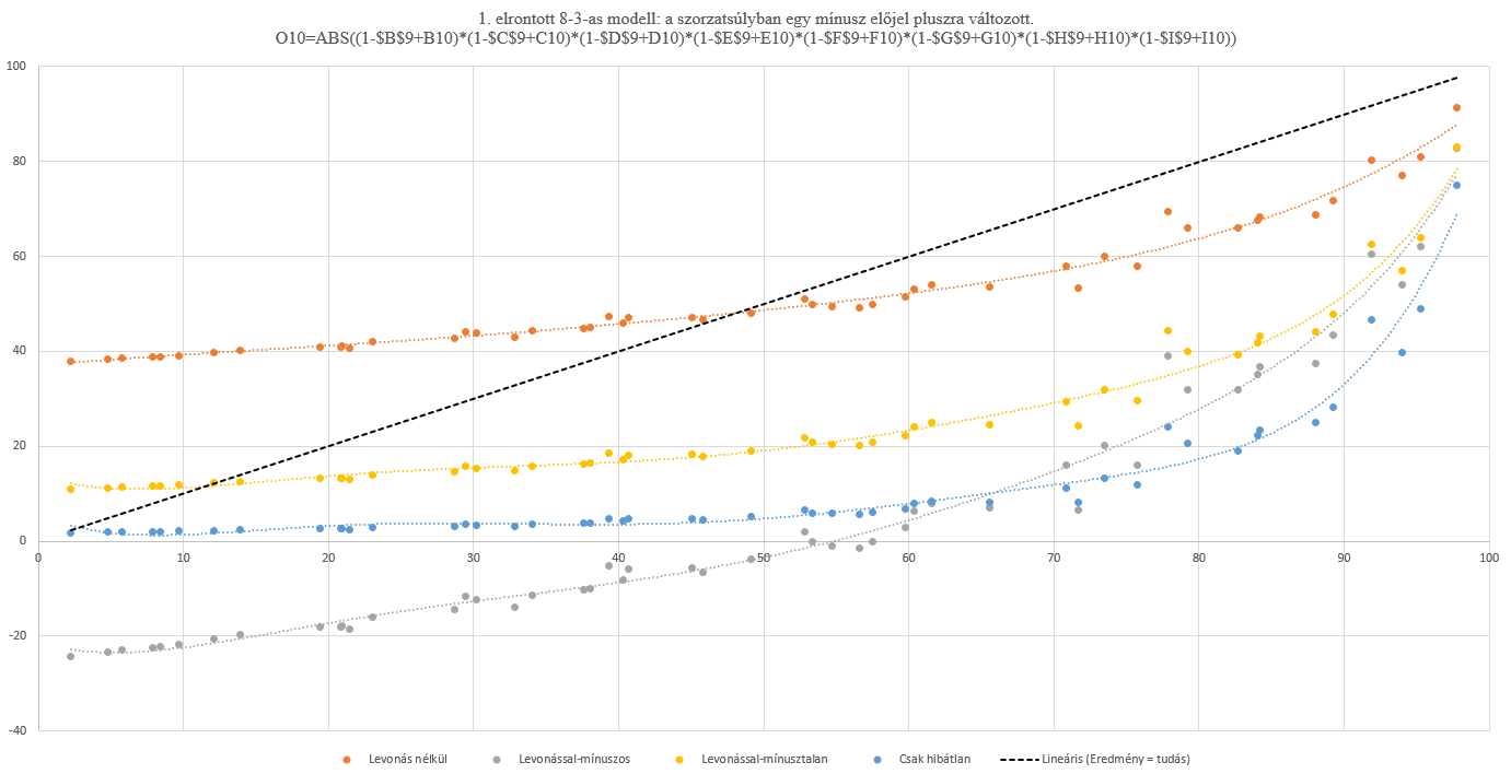 A következtetés annyira lehengerlő, hogy annak láttán a tanulók rögtön elálltak a meggyőzésemtől. És valóban: hogy is lehetne igazságos az a pontozási rendszer, amely egy csupa 4-2-es tesztkérdésből álló redmentás dolgozatnál a semmit nem tudó, vaktában tippelgető tanulóknak statisztikailag 50%-os eredményt valószínűsít? És hogyan lehetne ez "az egyetlen korrekt pontozás?" A választ rábízom az értő olvasóra...