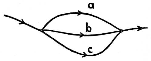 Hasonlóképpen tegyük fel, hogy a villamos főáramvezeték több ágra szakad (166. kép a, b, c), majd ismét egyesül. A villamos feszültség következtében a fővezetékben vándorló elektronok mozgásukat az egyes elágazásokban folytatják. Másodpercenként az elágazásokba együttesen ugyanannyi elektron nyomul be, amennyi másodpercenként a fővezeték bármelyik keresztmetszetén áthaladt, mert az elágazási pontban nem torlódhatnak az elektronok. Másszóval, a fővezeték áramerőssége az egyes elágazó vezetékek áramerősségének összegével egyenlő. Továbbá arra az elágazásra jut nagyobb áramerősség, amelynek kisebb az ellenállása. Ha pl. csak két ágra oszlanék a főáramvezeték és az egyik ág ellenállása 9-szer nagyobb, mint a másiké, akkor 9-szer nagyobb ellenállású ágra jut a főáramerősség 1/10 része, a másikra pedig 9/10 része. Ennek különösen nagy fontossága van a villamos árammérő készülékek használatában. Lehet pl., hogy mérőkészülékünk csak 1/1000 ampert 1 milliampert bír el, ennél erősebb áram veszélyeztetné a készüléket. Megállapítjuk, hogy hány ohm a mérőkészülék saját ellenállása, és annál 999-szer kisebb ellenállású, tehát aránylag vastag drótot kapcsolunk a mérőkészülékkel elágazásba; ebben az eseten az erős főáramnak csupán 1/1000 része halad át a kényes mérőeszközön. Ezt az eljárást angol szóval a mérőkészülék söntölésének nevezzük.