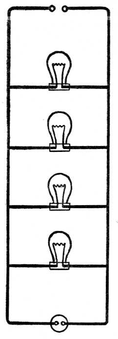 Ha azonban két izzólámpát megfelelő vezetékek segítségével úgy csatolunk be egy fali kapcsolóba, hogy az áram egymásután menjen át a két lámpán, akkor mind a két lámpa csupán gyengén izzik. A két lámpának ilyen, ú. n. soros kapcsolása esetén a lámpák együttes ellenállása az egyes lámpák ellenállásának összege, ennélfogva az áramerősség kisebb, mint bármelyik lámpának közvetlen becsatolása esetén, s nem elegendő a lámpa rendes izzításához. A soros kapcsolásnak többek között akkor vesszük hasznát, ha több kisebb feszültségre készült izzólámpát akarunk 110 volt feszültségbe bekapcsolni. Ha pl. karácsonyfára 10 voltos lámpákat akarunk szerelni, ezekből 11-et sorba kapcsolunk és így csatoljuk be a 110 volt hálózati feszültségbe. Ekkor az egész feszültség megoszlik, mindegyik lámpára 110 voltnak 11-ed része jut. Ha azonban a sorba kapcsolt lámpák valamelyike kiég, az egész sorban megszakad az áram.