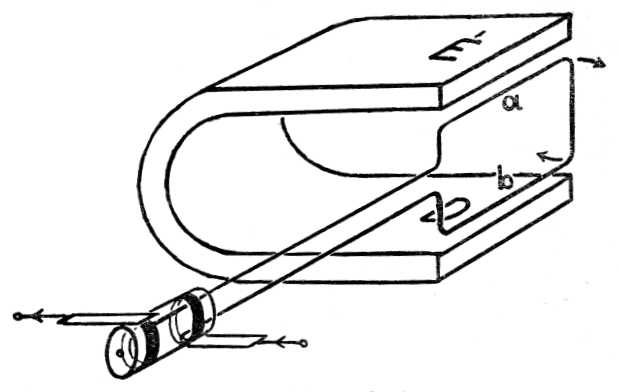 A váltóáram időbeli lefolyása. Váltóáramot még másféle módon is kaphatunk. Széles patkómágnes sarkai között a mágneses erővonalak a két sarkot kötik össze és nagyjából egyenes vonalak. Ugyanilyen a mágneses erőtér a kétszárú elektromágnes sarkai között is, ha az elektromágnes két szára ellentétes tekercselésű, és így az áram bekapcsolása után különnevű sarkok keletkeznek. Szereljünk fel ilyen ú. n. homogén mágneses erőtérben, tehát pl. elektromágnesünk sarkai