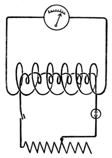 áramkörbe változtatható ellenállást (tolóellenállást) kapcsolunk be (181. kép). Az elsőleges áramkör ellenállásának változtatásakor változik az áramerősség ugyanakkora elektromotoros erő esetén és viszont. Azt tapasztaljuk, hogy az elsőleges áram erősítésekor ugyanolyan irányú áramlökést kapunk a másodlagos áramkörben, mint az elsőleges áram bekapcsolásakor, vagy az elsőleges tekercs közelítésekor.