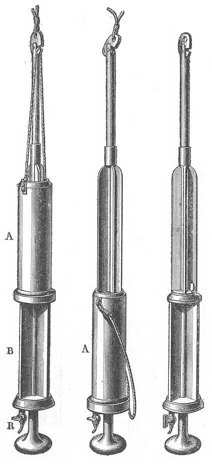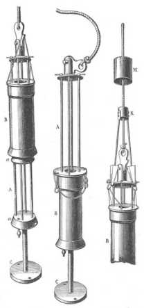 Buchanan merítő palaczkja. (16. rajz, a két középső műszer.) Képzeljünk egy hengert, mely mindkét végén csappal van ellátva, és a két csapot egy pálcza köti össze, úgy hogy egyszerre nyílnak és záródnak. Sülyeszszünk a tengerbe egy ilyen csövet, függőlegesen erősítve a szondáló fonálra, nyitott csapokkal. A víz behatol az alsó csapon és távozik a felsőn keresztül. Tegyük fel, hogy valahogyan egyszerre elzárjuk a két csapot valamely adott mélységben; a palaczk ebből a mélységből való vízzel megtöltve jön vissza. Ez az elve a BUCHANAN palaczkjának.
