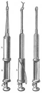 Meyer merítő palaczkja. MEYER dr., a kieli bizottság tagja, 1872-ben találta fel a nevét viselő palaczkot, a melyet a 75. rajz leszállásra készen mutat. B mindkét végén széles nyílású henger, a melyen a felfüggesztő lemezhez erősített négy pálcza megy keresztül. A felső lemez a szondáló fonálhoz erősített horgos kikapcsoló szerkezettel van ellátva, melyen a henger is függ. A négy pálcza két gondosan csiszolt kúpszelepet köt össze mereven, melyek záráskor a henger mindkét végébe csiszolt nyakba illeszkednek. A mikor a készülék földet ér, a C korong, melyet egy középső pálcza mereven köt az alsó szelephez, nem engedi, hogy a palaczk az iszapban elmerüljön