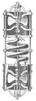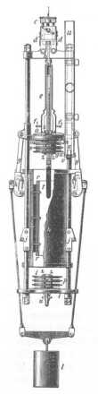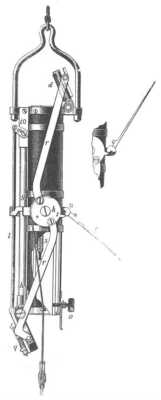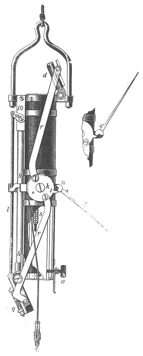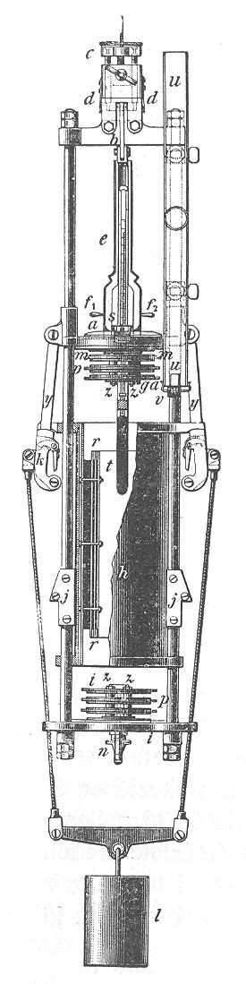 felhozott víz többé nem az, a mit felvenni akartak. Hogy tehát a szelepeket felhúzás alatt zárva tartsák, a műszer felső részén, a henger felett elhelyezett csavarszárny működését használják fel. Ez a csavarszárny nn úgy van elhelyezve, hogy leszálláskor nem hat a szelepekre és a foglalat felső része felé emelkedik. Felhúzáskor ellenkezőleg lesülyed, rr nyúlványával megragadja a tt darabot, melyet rácsavar a felső szelepre; akár normális az emelkedés, akár nem, az egész idő alatt tt-t a csavar nyúlványa rögzíti, úgy, hogy a felszállás kezdetétől fogva a felső szelep és következésképpen az alsó is zárva marad, egészen addig, míg a felületre nem érnek.