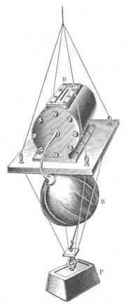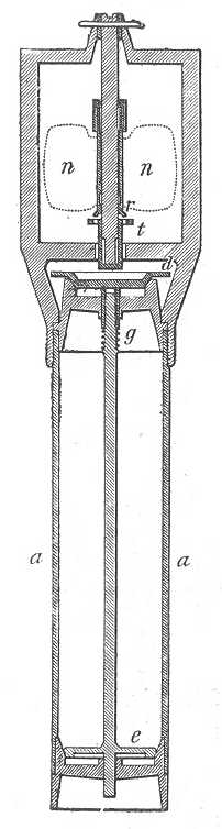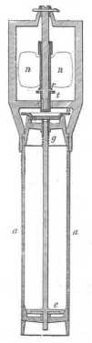 A palaczk a tetejéhez erősített fémkengyellel a kábelen függ (92. rajz). A palaczkot két mm. vastagságú ebonit-réteg veszi körül és 3 konczentrikus hengerből áll. A csapágyas korongok, a melyek a henger végeit elzárják, vastag gummilemezzel bélelt ebonitból