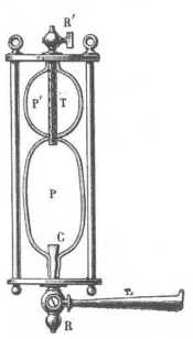 Regnard dr. palaczkja. (85. rajz.) Egy igen vastag gummiból készült P ballon, a mely úgy van készítve, hogy összenyomás után hirtelen újra felvegye alakját, aljánál fogva egy csőhöz van erősítve, a mely a C Denayrouze-féle szelep közvetítésével az R csappal közlekedik; ez a P ballon egy ebonit-cső (T) alsó részéhez van erősítve, a mely lyukakkal van ellátva és felfelé az R' csapba nyílik. A T ebonit-csövet majdnem teljesen körülveszi egy másik, de vékony-falú közönséges gummiballon.