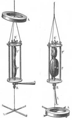 A 86. rajz mutatja a leszállásra kész palaczkot, miután R-et bezárván, 1?' csapon keresztül, higanyos légszivattyú segítségével kiürítették és R'-et bezárták. A két ballon falai szorosan egymásra fekszenek. A kívánt mélységben az A vasgyűrűt leeresztik, a mely a L emelőkart lenyomva a R csapot kinyitja. A P ballon hirtelen vízzel telik meg és kiterjed. A 87. rajz mutatja a műszert