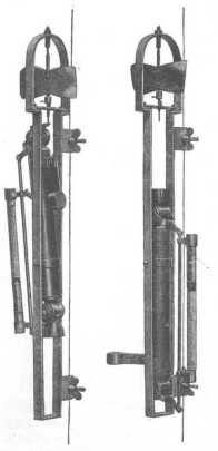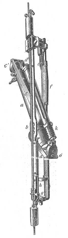 Több ilyen palaczk helyezhető ugyanazon kábelre egymás fölé; ez esetben mindegyik úgy van elrendezve, a mint a 90. rajzon látható. A h pálcza felső horgát a d emelőkar felemeli, a mikor a palaczk átbukik, ez szabaddá teszi a futósúlyt, a melyet ez a h pálcza a foglalat alatt tartott és ez a súly kapcsolja ki a következő palaczkot és így tovább.