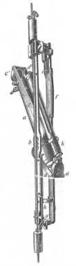 A csapot 90°-kal elforgatva csatornájának belső nyílása összeköttetésbe kerül a b csatornával, ez az első záródás; a csapnak ugyanezen mozgásával az e bevágódása, az s szelep t szárának a végével szembe kerül; a t pálcza rugója e pálcza végét az e be-