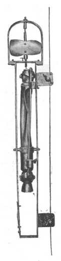 akár futósúlylyal mozgásba hozott emelőkarra járhat, van elhelyezve a palaczk, egy 25 cm. hosszú és 4 cm. átmérőjű, mindegyik oldalán csappal elzárt cső. A két csapot pálcza köti össze oly módon, hogy egyszerre nyílnak és záródnak. A pálczára két rézgyűrű van erősítve, melyek arra valók, hogy egy átbukó hőmérőt fogadjanak magukba és szabadon csúszhatnak a pálczán vagy pedig ott szorítócsavarral rögzíthetők. A palaczk az alsó harmadában elhelyezett vízszintes tengely körül foroghat; eredeti helyzetében a csavarszárriy tengelyének egy nyúlványa tartja meg, vagy pedig a futósúlyrendszer esetén az emelőkarral kapcsolatos peczek. A palaczk gyengén hajlott helyzetben száll alá és az alsó kúp élénkíti a vízáramlást; felszálláskor a csavar, ellenkező irányban forogva, kiszabadítja a palaczkot, mely átbukik, a két csap bezáródik és pedig annál jobban, mert a hőmérő szintén átfordulva saját súlyával ugyanebben az irányban működik közre. Az emelőkaros szerkezetben ezt az eredményt egy leeresztett futósúly idézi elő. Egy kis ólomnehezék odaszorítja a palaczkot egy állító rúgóhoz, a mely az átfordulás után helyzetében megtartja.