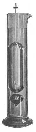 3. Az areométerek módszere. Ezek ólomseréttel vagy higanynyal nehezített úszók, melyeknek súlyát és lemerült részüknek térfogatát, vagyis a sűrűség meghatározására szolgáló összes elemeket minden pillanatban ismerjük. Hajón is alkalmazhatók. Részlegesen és teljesen bemerülő areométerekre osztjuk őket. Az elsők még két csoportra oszlanak: egyik az állandó súlyú és változó térfogatú, a másik változó súlyú és térfogatú. Mindegyikük gondosan kalibrált vékony üvegpálczában végződik, a mely belül papírra rajzolt skálát hord. A megvizsgálandó tengervizpróbába merítik őket, a mint a 97. rajz mutatja.