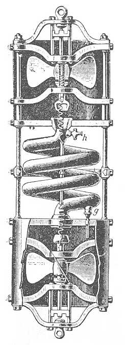 kering belsejükben a két fordított tölcsér segítségével, a melyek a csövek aljára vannak erősítve és élénkítik az áramlást. Azonkívül az is elősegíti a keringést, hogy a csapok belső nyílásainak átmérője ugyanakkora, mint a csöveké. Mikor a palaczkot visszahúzzák, a csavar ellenkező irányban forog, a két cső leesik és így elzárja a csapokat.