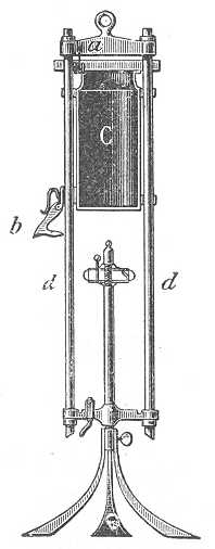 Ekman merítő palaczkja. (82. rajz.) A C rézhenger mindkét végén nyitott és foglalatjának felső részénél fogva az a horogra van függesztve. A henger felső nyílása kiugró, vízszintes, lapos fémkarimával van ellátva. Ez a henger pontosan csúszhat