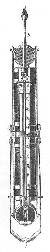 Változó súlyú és térfogatú areométerek. Legjobb közülük a BUCHANAN-tól a Challengeren alkalmazott minta, mely a 97. rajzon látható. Egyetlen műszer lehetségessé teszi a tengervíz sűrűségének igen pontos megmérését, miután egyszersmindenkorra meg van határozva a műszer sulya, továbbá térfogata és a milliméterekre beosztott pálcza egy skálarészének térfogata. Az areométert tengervizet tartalmazó mérőhengerbe teszik; gyűrűalakú ismert súlyokat raknak a műszer szárán levő kis asztalkára, a mire a víz szintje bizonyos skálarészre beáll. Ezzel ismerik a lemerült V térfogatot, vagyis a helyéből kiszorított víznek a térfogatát; a műszer és a hozzáadott gyűrűk súlyának összege megadja a kiszorított víznek P súlyát és P/V megadja S4t sűrűséget a kísérlet tartama alatt érvényes t hőmérséklet mellett, ha az összes súlyokat a 4 fokos viz sűrűségére számítottuk át. A műszerek mindegyikéhez csatolt táblázat megadja a műszer súlyának és az egyes skálarészekhez tartozó térfogatoknak pontos értékét, valamint a szükséges korrekcziókat is. A leolvasás megtörténte után új súlyokat lehet a műszerre rátenni és ezzel a pálczának másik beosztását hozni a víz szintjébe; így több sűrűség-megfigyelést lehet végezni