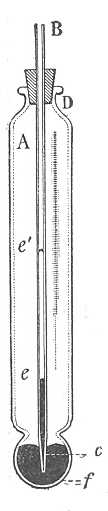 94. rajz. Buchanan piezométere. *) Az A edényben (94. rajz) tengervízminta van, melynek tömege és sűrűsége ismeretes és melynek összenyomhatóságát megadott tengervíz-oszlop súlya alatt ismerni óhajtjuk. A B cső térfogat szerint van beosztva. A készülék úgy lévén megtöltve és bedugva, mint a rajz mutatja, megvárják, míg a hőmérséklete pl. a felületi tenger vízével kiegyenlítődik, azután megfigyelik a higany e szintjét és leeresztik a műszert az előre megállapított mélységbe. A nyomás hatása alatt a B cső egész higanya a C edénybe szorul, a B cső megtelik tengervízzel, majd ez a víz keresztülmegy a higanyon és egyesül azzal, a mely már előbb A-ban volt és pedig a mélység szerint kisebb vagy nagyobb mennyiségben. Mikor a készüléket felhúzzák, a kitágulás megkezdődik; A vize B csőbe szorítja a higanyt és a mikor az egész visszakerül a felszínre, e' szintbe ér. A két szint e és e' különbsége a B csőben megadja azt a térfogatot, a mennyivel A vize összehúzódott az elért mélységnek megfelelő nyomás hatása alatt és ebből könnyen levezetik azt a mennyiséget, a melylyel a térfogategység egy légköri nyomás hatása alatt összehúzódik, vagyis az összenyomhatósági együtthatót, számot vetve a kísérlet különböző elemeivel, a higanynak és a piezométerben levő