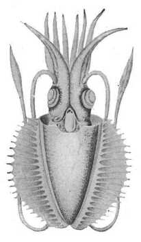 A Ctenopteryx cyprinoides JOUBIN (294. rajz) egy, a Földközi-tengerben fogott delfin gyomrából került elő; úszóit vékony hártya alkotja, mely merev pálczikák közt van kifeszítve; ilyen berendezést semmi más Cephalopodá-n sem találunk. Ennek a fajnak, valamint a következőknek is belső vázuk van, mely szarúnemű, többé-kevésbbé keskeny, vékony, átlátszó lemez s az állat hátoldalán található. A Cucioteuthis unguiculata (295. rajz) nagytermetű állat, úszói nagyon jól fejlettek s minden szívója szarúgyűrűvel ellátott horoggal van felfegyverezve. Némelyik horog nagyobb 25 mm.-nél, míg szarúgyűrűje 30 mm.-nél is nagyobb lehet s nemcsak nagyságával tűnik ki, hanem egyszersmind támadó és védőfegyver még a busafejű czet (Physeter) ellen is, mely eszi ezt az állatot. Azt a Cucioteuthis-t, a melyről a föntebbi méreteket vettük, egy 14 m. hosszú s 1905 július 18-án az Azorok táján