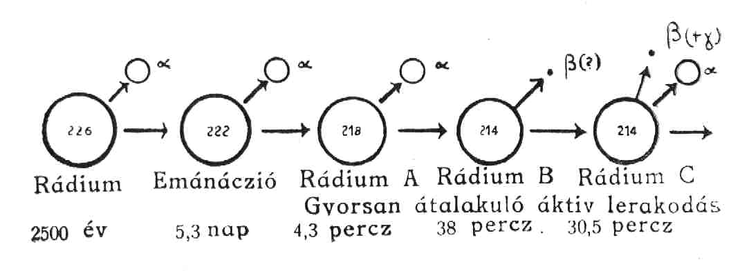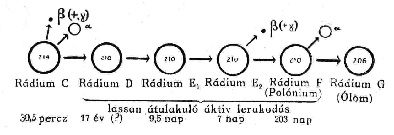 sebességgel változik át egy α-részecske kilövellésével; átlagos élettartama csak 4.3 perez. A második képződmény, a rádium B, olyan változáson megy át, a mely eleinte teljesen "sugártalan"-nak látszott. Nem lehetett benne sem közönséges α-‚ sem β-sugarakat fölfedezni, újabban azonban van bizonyítékunk reá, hogy igen gyöngén áthatoló β-sugárzás mégis keletkezik. Átlagos élettartama 38 percz. Tovább nem foglalkozunk vele. A harmadik képződmény, a rádium C, úgy változik, hogy α- és β-részecskéket is kilövell (tehát egyszersmind γ-részecskéket is, mert ezek rendesen együtt járnak a közönséges β-részecskékkel). Átlagos élettartama 30.5 percz. Lehetséges, hogy ez a változás két más változásból van összetéve, de ezek oly gyorsan követik egymást, hogy eddig hatásukat nem lehetett egymástól különválasztani.