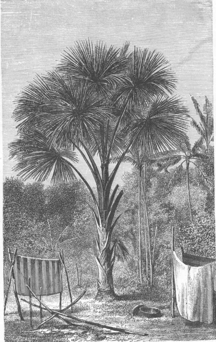 De nemcsak a kunyhóhoz szükséges anyagokat, meg a mindennapi kenyeret nyujtja e pálma; a mi kevés ruhafélére van szükségük, mind a pálma leveléből telik ki. A levelek hüvelyéből, azaz abból a részből, mely a szárhoz simul, czipőt készítenek, a fa rostjaival pedig lábukhoz kötik.
