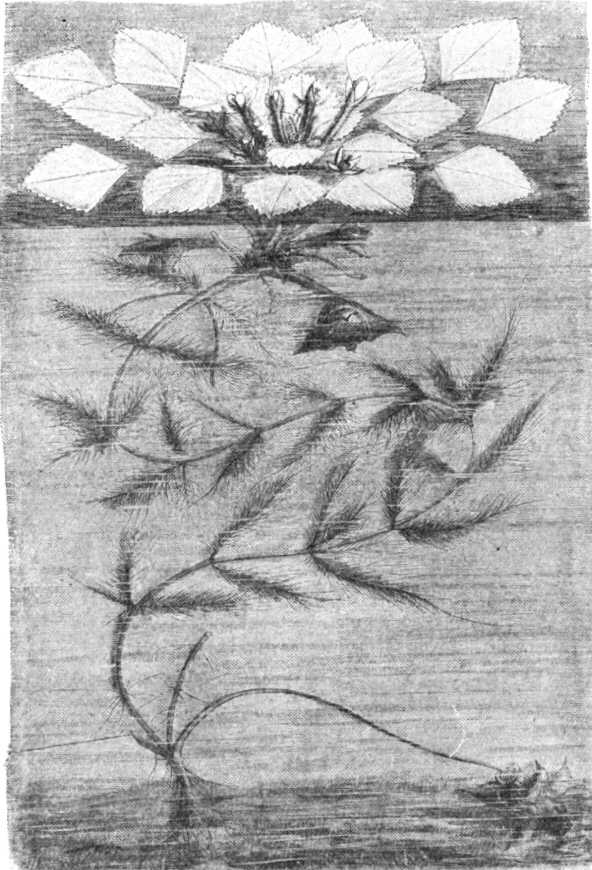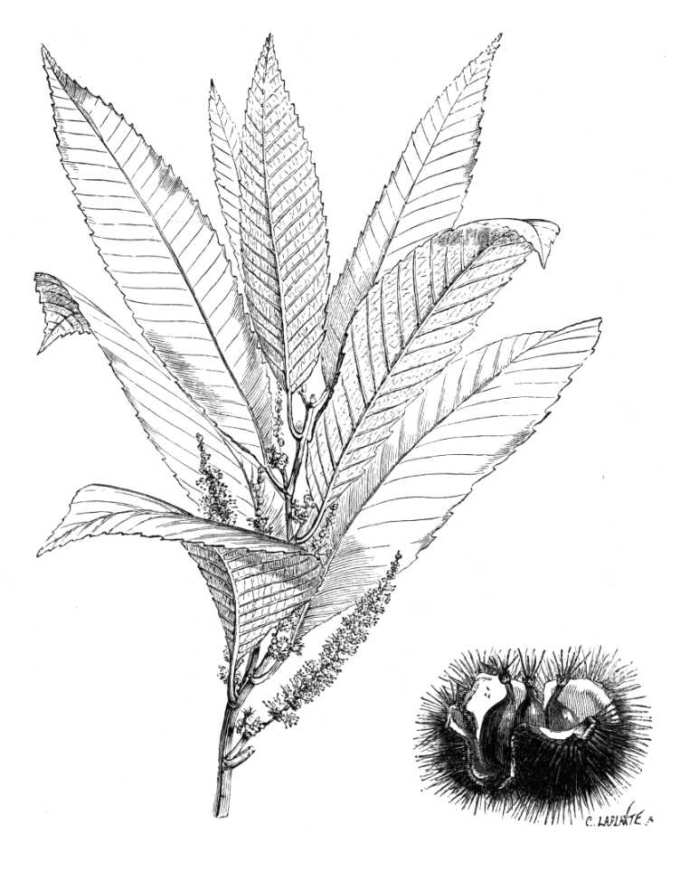 6. kép. A jóféle gesztenyefa (Castanea vulgaris) virágos ága és nyilt, tüskés terméscsészéje három gesztenyével.