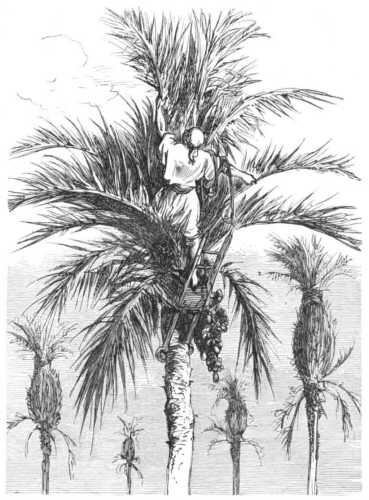 Ezek közül első helyen említem a datolyapálmát (Phoenix dactylifera), mely Afrika északi részeiben terem (4. kép). Jelenleg az Indus folyóig és az északi szélesség 15. és 30-ik foka közt terülő forróövben honos. Kivételesen északibb vidéken is találni, a nélkül, hogy gyümölcsöt érlelne. Az említett kietlen forró vidékeken rendkívül nagyfontosságú e növény. Újabban Amerikában is termesztik már. A fának legjobban kedvez a homokos-agyagos, sóban és vízben bővelkedő talaj, minőben minden más növény tönkremegy. Az arab azt mondja róla: Az oázisok királya (t. i. a datolyapálma) vízben tartja a lábát, fejét pedig felemeli a Nap tüzébe. Ősidők óta művelik, úgy hogy vad állapotban legfeljebb Perzsiában lehet találni. Évezredek termesztése következtében számos fajt különböztetnek meg; van Arábiában olyan faja is, a melynek fehér a gyümölcse. A növényt az érdekelt népek nagyon gondozzák, mert ez adja nekik a mindennapi kenyeret. Minthogy a növény kétlaki, azaz a porzós virágok más fán teremnek és máson a termősek, nem szokás a beporzást a véletlenre bízni. Februáriusban,