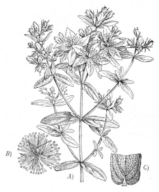 60. kép. Csengő orbánczfű (Hypericum perforatum). A) a szára, B) a virágja, C) levelének alsó része.