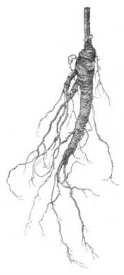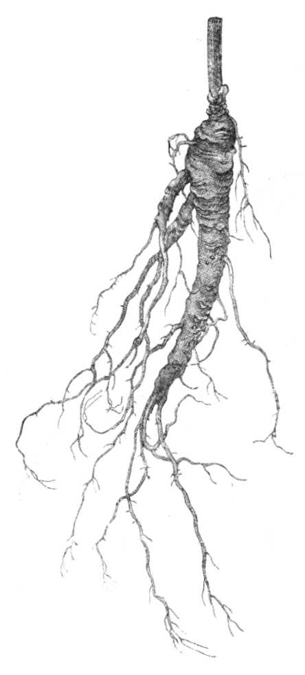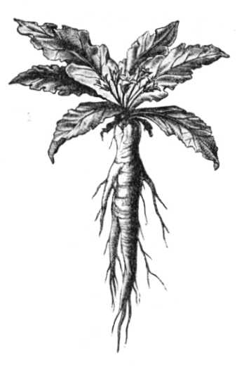 A varázslatellenes növények közül utolsónak említem a khinaiak egyik különlegességét az úgynevezett élő embert (Ginseng), mely nem más, mint az Araliaceák csoportjába tartozó Panax Ginseng nevű khinai növény (61. kép) gyökere. Közönségesen "az erő gyökerének" nevezik s minthogy sokszor emberi alakra emlékeztet, khinai nyelven: gin-seng-nek, azaz élő embernek nevezik. E növény gyökere (62. kép) Khinában minden betegség szellemét el tudja űzni, a miért nemcsak mint orvosság a halálán levő betegnek utolsó reménye, hanem a varázslatban is hasonló czélra szolgál.