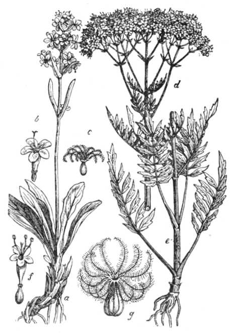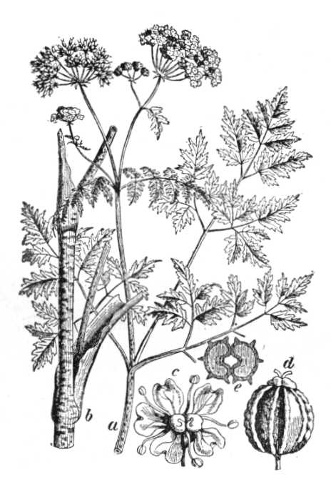 a a növény ága a virággal, b a szára, c a virágja, d a termése, e a termés átmetszetben.