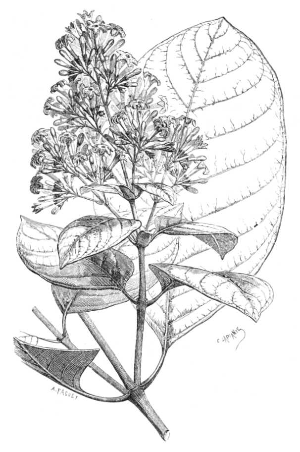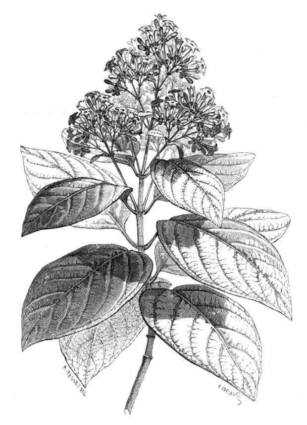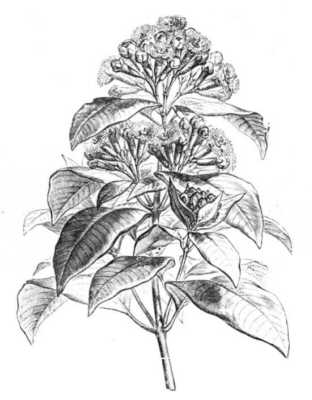 73. kép. A valódi fahéjfa (Cinnamomum zeylanicum) leveles, virágzó ága.