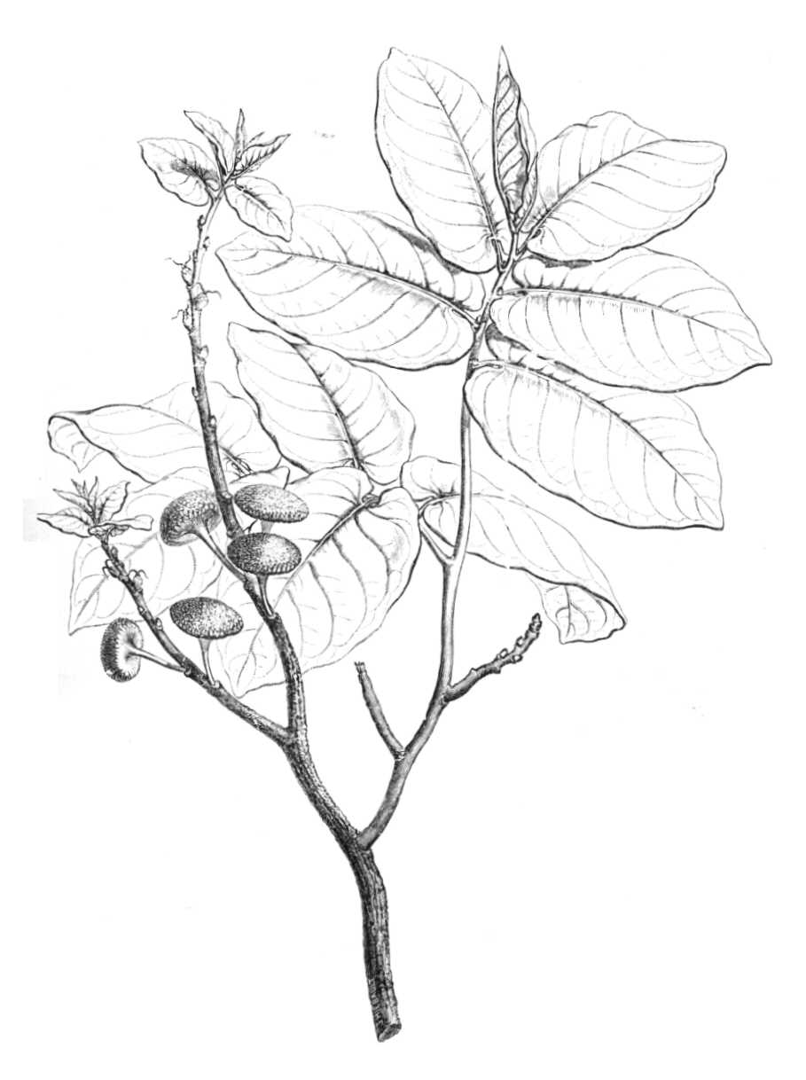 72. kép. A méregfa (Antiaris toxicaria) ága hím virágfejecskékkel és nővirágokkal.