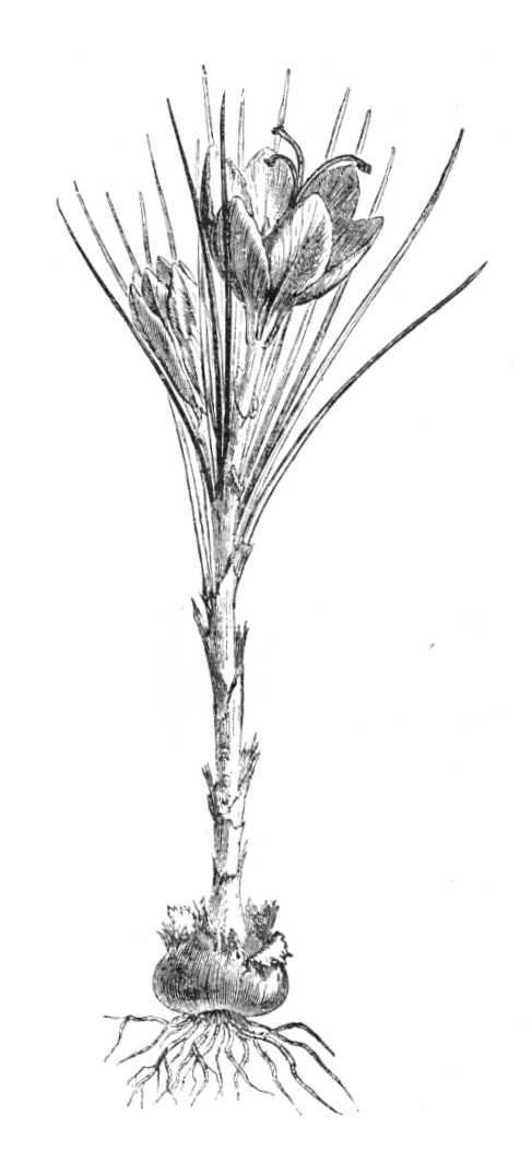 Az istenek kedveltjei közül részint mint kerti dísznövény, orvosszer és festőanyag, részint mint fűszer, rendkívül nagyfontosságú az egyszikűekhez tartozó sáfrány (Crocus sativus). A növény (74. kép) Kis-Ázsiában és Perzsiában vadon terem s már a legrégibb időben magára vonta az emberek figyelmét. Az egyiptomi papiruszok már megemlékeznek róla; a Biblia is említi. A régi zsidók és görögök kertjeiben mint dísznövényt találjuk. A görö-