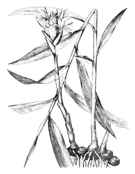 78. kép. A gyömbér (Zingiber officinale) gumója és a virágos ága.
