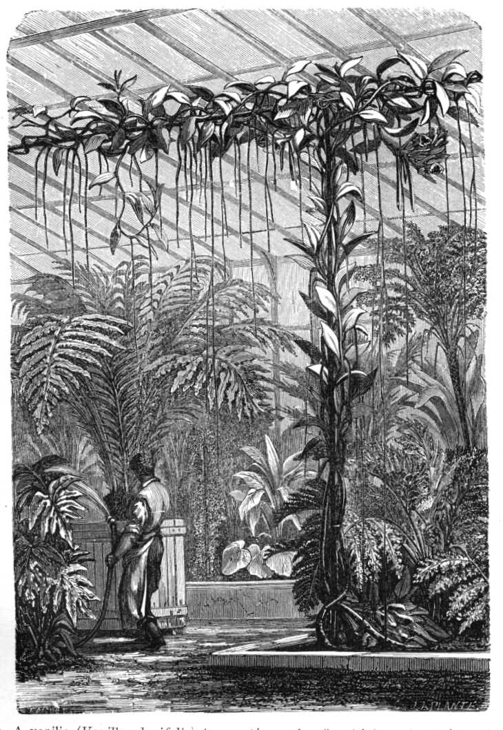 79. kép. A vanilia (Vanilla planifolia termesztése meleg üvegházban. A növény a fedél alatt levő rudon terül, és hüvelytermése onnan csüng alá.