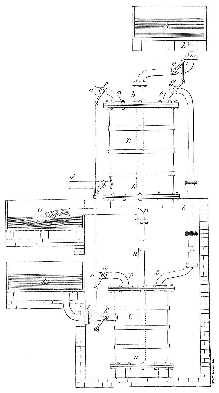 köbtartalma tehát mintegy 83 köbláb, vagyis közel fele a fölső henger köbtartalmának, t. i. 170 köblábnak. Az alsó henger fenekétől 4 hüvelyknyire van az nnn folyasztó cső nyílása, mely szintén 4 hüvelyk átmérőjű s mely a fölemelt vizet o edénybe önti, hová a víz a d csőből is ömlik, hogy innen aztán a tárnán át lefolyjon. A gép járása most már könnyen megérthető. Legyen ugyanis a B edényt vízzel megtöltve, a C edény azonban üres, a c, g, f, m, k csapok csukva, az e csap azonban nyitva, ugy a víz egyrészt saját súlyánál, másrészt pedig a fölötte levő összenyomott levegő nyomásánál fogva a d csövön nagy erővel kitódul. De minthogy a levegő összenyomottsága nem tart ki addig, míg minden víz kifoly; azért az f, m és k csapok egyidejűleg kinyittatnak, hogy a d csövön a víz maradéka kiszaladhasson, a C edény pedig, a levegőnek p-n át való kimenekvése közben, az L tócsából egészen megtelődhessék vízzel. Mikor ez meg van t. i. mikor a B edény kiürült, a C pedig megtelt akkor c csapot nyitják ki, minek következtében a felső edény 136 láb nyomás magasságú vízzel telik meg; az összeszorított levegő hhh csövön az alsó edénybe ér s innen a benne levő vizet nn csövön fölhajtja, míg o-nál ki nem foly. Erre a gép most leirt játéka újra kezdődik. E közben adja elő magát az az ismeretes, nevezetes jelenség, hogy a kifolyás vége táján, mikor már a rendkívül összenyomott levegő a víz utolsó maradékával zudul ki az nn kifolyasztó csövön a víz a cső karimáján jéggé válik s a levegő által nagy erővel lódíttatik odább, s hogy a cső szájához tartott nedves kendő rögtön megfagy.... A csapok kormányzását e gépnél munkások végzik s ez okból Boswell egy oly mechanismust gondolt ki, mely a gépnek önkormányzását eszközli. Az ily készülék bizonyára hasznos lenne, minthogy e gép minden tekintetben nagyon figyelemre méltó, a mennyiben oly helyeken is alkalmazható, hol a körülmények miatt mást nem lehet használni. Boswell készüléke azonban nagyon