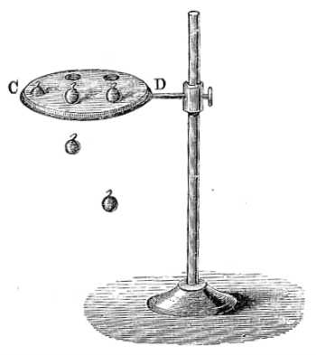 164. Engedjék meg egy egyszerű kisérlet által felvilágosítanom a különbségeket, melyek az egyes testek között léteznek a bennök foglalt hőmennyiséget illetőleg. Egy viaszlepény van itt; átmérője hat, vastagsága félhüvelyk. Ezen edényben pedig olaj van, melynek hőmérséke most 180° C. A forró olajban golyók vannak különböző fémekből: vas, ólom, bizmút, ón és rézből. Most valamennyinek egyenlő a hőmérséke t. i. az olaj hőmőrséke. A golyókat kiszedem az olajból s CD viaszlepényre rakom, mely e lombiktartó gyürűjén fekszik. A golyók olvasztják az alattok lévő viaszt s belé sülyednek. Sülyedésök azonban különböző gyorsasággal történik. Vas és réz a többinél hathatósabban nyomulnak az olvasztható tömegbe; legközelébb jár utánok az ón, míg az ólom és a bizmút egészen hátra maradnak. A vas most már átesett, követi a réz, az ónnak alsó része még kibúvik a lepény alsó lapjából, de tovább már nem képes hatolni, míg az ólom és a bizmút csak csekély mélyedést okoztak, alig sülyedtek felényire a viaszlepénybe.