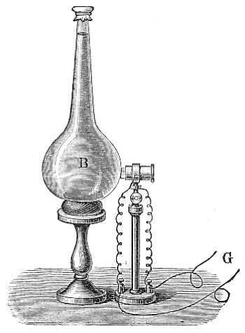 187. Hogy a hűlésnek azon fokát mutassam meg, melyet a víznek elpárologtatása által elérni lehet: egy készüléket hoztam ide, melyben a víz csak a saját gőze által eszközölt hőelvonás következtében fagy meg. E készülék kryophornak neveztetik és Dr. Wollaston találmánya. Következő módon készül. E két golyó egyikébe A kevés vizet kell önteni, a másikat B izzítani s egy részét finom nyilású csövé kell kihúzni. Az után forralni kell az A-ban foglalt vizet mindaddig, míg a kifejlődött vízgőzök a B golyó csövén elillanható levegőt egészen ki nem hajtják. Ha ez megtörtént, azaz ha a golyókban és a golyókat összekötő csőben tiszta gőz van, akkor a nyílás forraszcső segélyével beolvasztandó. A készülékben tehát van víz és vízgőz, a levegőnek majdnem minden nyoma nélkül. Hallják, hogy a víz csörren benne, épen úgy, mint elébb a vízkalapácsban.