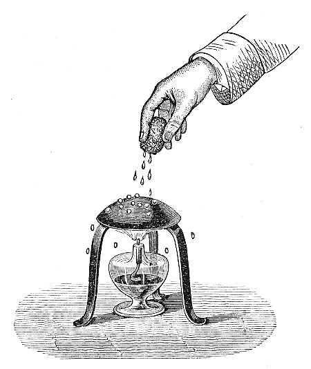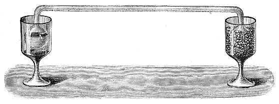 184. Törött jégből és sóból álló keveréket használtunk egy előbbi alkalommal, hogy kemény hideget idézzünk elé. Só és jég összekevertetvén halmazállapotukat változtatják, s ennek következményeképen a keverék hőmérséke több foknyíra a víz fagypontja alá esik. Itt van egy rakás óraüveg, ónlevélbe burkolva s jégből és sóból álló keverékbe mártva. Minden óraüvegben kevés víz volt, melyben a következő üveg feküdt. A keverék hidege most valamennyit egy szilárd hengerré fagyasztotta össze.