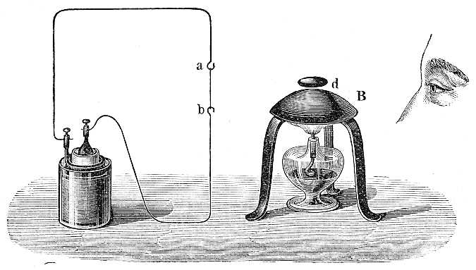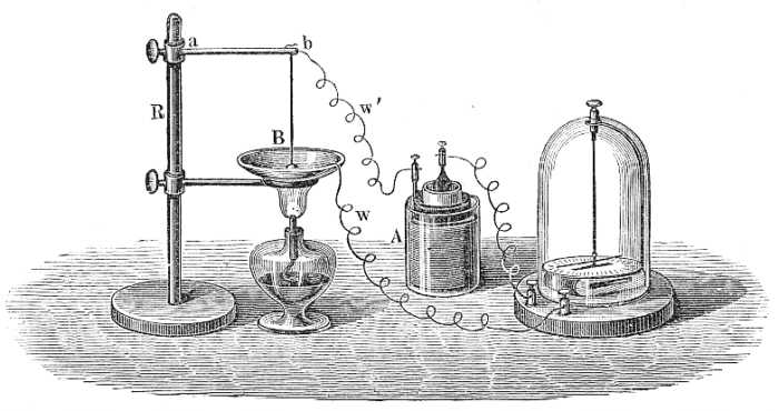 197. Ime egy más berendezés, Poggendorff tanártól ered s elmésen teszi szemlélhetővé a megakasztott érintkezést a csöpp és azon lap között, melyen a csöpp nyugszik. A csöpp felvételére szánt B ezüstcsészétől w huzal vezet a galvanométer delejtűje körül futó huzal egyik végéhez; e huzal másik vége A galvánelem egyik sarkával közlekedik. Ugyanezen elem ellenkező sarkától w' huzalt vezetek R lombiktartónak ab mozgatható karjáboz. A csészét megmelegítem, vizet öntök belé s huzalomat lefelé tolom, úgy hogy hegyével a gömbölyded tömegbe merüljön. Mozgás a galvanométer tűjén nem vehető észre, pedig itt csak a csöpp alatti hézag lehet az,