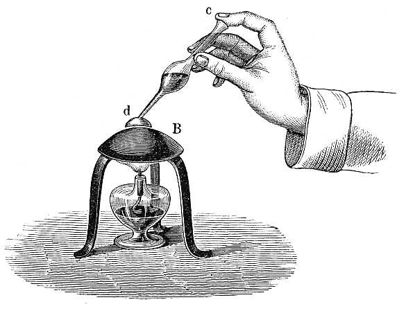 203. Bizonyos mennyiségű higanyt kúpalakú rézkanálba öntök s ez utóbbit besülyesztem az olvasztótégelybe. Az aether meggyúlt a tégelyben, s ez szándékom ellenére történt. A kisérletnek tulajdonképen úgy kellene történnie, hogy a szénsavas gáz a bányák fojtólege megóvja az aethert a meggyuladástól. De a higany mégis meg fog fagyni. Kiveszem a kanalat a tüzből a lángon keresztül; íme itt van benne a megfagyott fém.