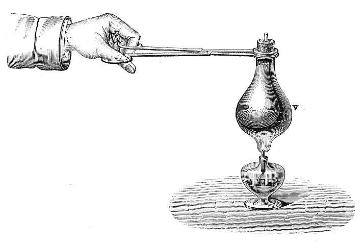 öntök belé, mely tehát e pillanatban gömbölyded-állapotban van. Most az edényt bedugaszolom a víz gömbölyded-állapota alatt kifejlődött gőz az üvegcsövön elillan azután eltávolítom a lámpától s vagy két perczig várakozom. A víz nem sokára érintkezésbe fog jöni a fémmel. Megtörtént, s a dugasz mintha lőpor robbant volna, meglehetős erővel röpül fel a magasba.