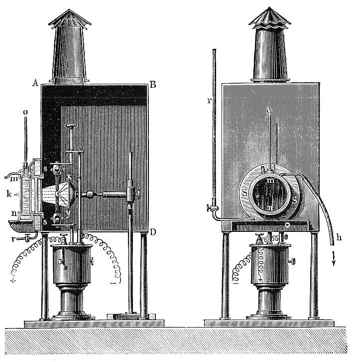 csúcsé a gyujtópont alatt keletkeznék. Mind a két kép élénken előtűnik; ha platinált platinalevelet teszünk a gyujtópontba. ss-nél (99. és 100-ik) átmetszetben és alaprajzban látható a gyürűalakú térség, melyben a hideg víz kering; r cső vezeti belé a hideg vizet, h pedig kivezeti a megmelegítetett.
