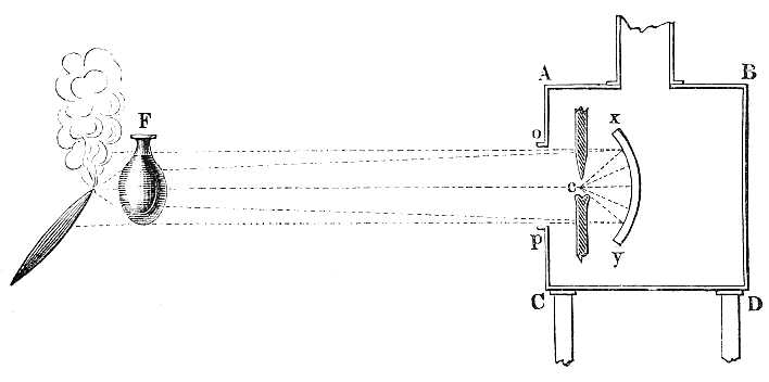 593. Egy pár előzetes kísérlet vékony platinalevéllel tagadó eredményt adván, az a kérdés támadt, vajjon a villanylámpa összes sugárzásával a világító és sötét összegével is lehetséges-e fehérizzást, égés nélkül, eléidézni? A lencsék használatát egészen mellőzve, a vékony platinalemezt egyenesen a széncsúcsok közelébe állítottam. Hátul állva, vártam a bekövetkezendő hatást; segédem pedig a lámpa mellett állott és szemei elé sötét üveget tartva a platinalevél és a villanyfény közötti távolságot változtatta. Midőn a platina 1/2 hüvelyknyire közeledett a széncsúcsokhoz, észre vettem, hogy vörös izzóvá lett. Csak azon kellett tehát lennem, hogy nagyobb távolságban létesítsek gyujtópontot, oly hevítő erejűt, minő a közvetlen sugaraké 1/2 hüvelyknyi távolságban.