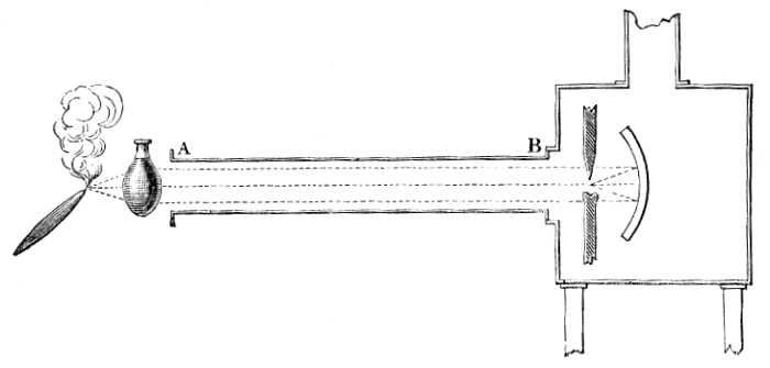 623. De a legjobb tükör is többé kevésbé szétszórja a sugarakat; s e szétszóródásnál fogva, nagyobb távolságban igen meggyöngül a sugárnyaláb. Következéskép a hatás erősbíthető, ha a nyaláb belül csiszolt csövön vezettetik végig; ez megakadályozza a sugárzó hő oldalaslagos szétszóródását. Ily csövet, a kamra elejére téve, a 103. ábrában AB ábrázol. A jódoldatos palaczkot a cső elé tartjuk kézben, vagy mozdulatlanul megerősíthetjük. Igy járván el, 50 elemes teleppel fehérizzásig hevíthetjük a platinát a palaczk gyujtópontjában.