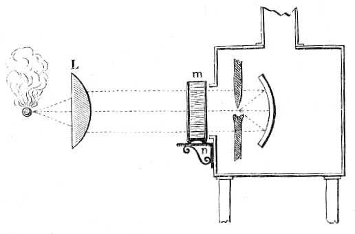 613. Ha igen erélyes hatásokat akarunk elérni, úgy lehetőleg sok láthatatlan sugarat kell összegyűjteni s azokat, a mennyire lehet, kis téren összetömöríteni. Mennél közelebb van a tükör a fényforráshoz, annál több sugarat foghat föl és verhet vissza; s mennél közelebb van a gyujtópont a fényforráshoz, annál kisebb maga a kép. Mind a két feltételnek eleget teendők, rövid gyujtótávolságú tükröt kell választanunk. Ha oly tükröt alkalmazunk, melynek nagy a gyujtótávolsága, úgy a gyujtópont csak akkor esnék közel a forráshoz, mikor maga a tükör messze állana a forrástól; de ha csakugyan ily messze állítanók fel a tükröt, úgy sok sugár elsurranna mellette. Ha